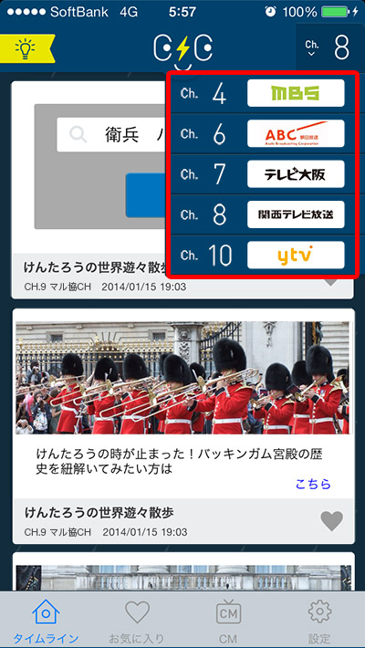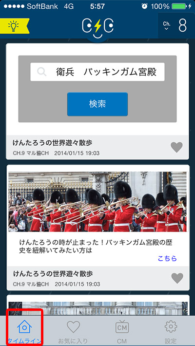 ボクを立ち上げながらテレビを見ると、番組・CMに関連した情報ブロックが、次々とタイムライン上に降りてきます。タップするともっと詳しい情報が表示されます。