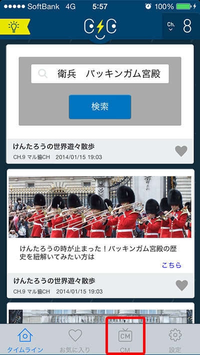 CMに関連するブロックを受信すると、CMのタイムラインに自動で保存します。メニュー下部のCMを選択すると一覧で見ることができるよ(*^^)v